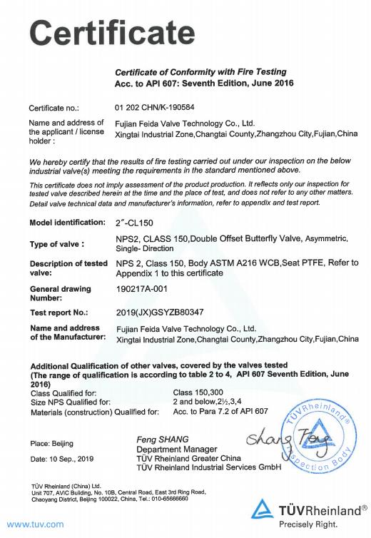 La vanne papillon à double excentrage haute performance et sûre contre le feu FEIDA a passé avec succès les tests d'incendie selon API 607. Cette vanne a deux sièges, le  siège souple principal est en matériau PTFE ou RPTFE qui peut obtenir une fermeture étanche sans fuite, tandis que le siège anti-incendie est en métal. Elle peut jouer un rôle de sécurité incendie tout en étant beaucoup plus économique que la vanne papillon à siège métallique à triple excentration.