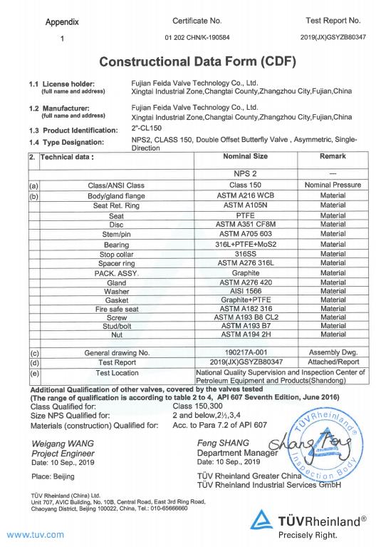 La vanne papillon haute performance résistante au feu FEIDA est certifiée anti-incendie selon la norme API 607, 7e édition.