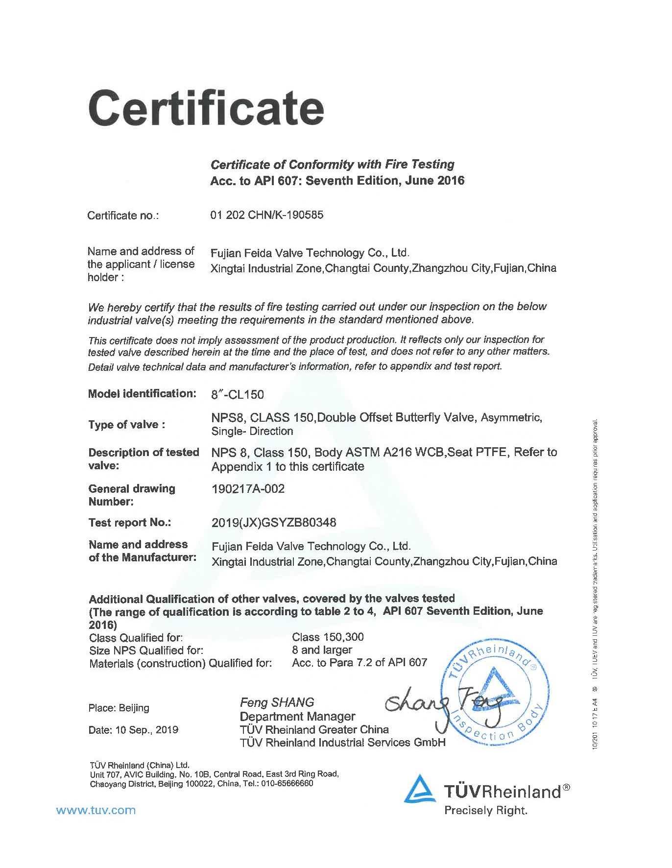 La vanne papillon haute performance de conception innovante FEIDA a récemment passé avec succès le test d'incendie de la norme API 607 de l'American Petroleum Organization. Ce nouveau type de vanne papillon hautes performances est principalement utilisé dans les usines chimiques, les usines pétrochimiques ou les appareils de fabrication de sucre. Cette vanne papillon double excentrage est dotée de 2 sièges d'étanchéité en RPTFE et d'un siège métallique en acier inoxydable. Le joint métallique de la série de vannes papillon anti-incendie à double assurance est également équipé d'un joint de siège en PTFE et en acier inoxydable, et le siège métallique peut toujours assurer l'étanchéité même si le siège en RPTFE est détruit par un incendie. Des tests ont montré qu'en cas d'incendie, le fluide inflammable manipulé par la vanne à l'état fermé présente une fuite très faible, voire inexistante.